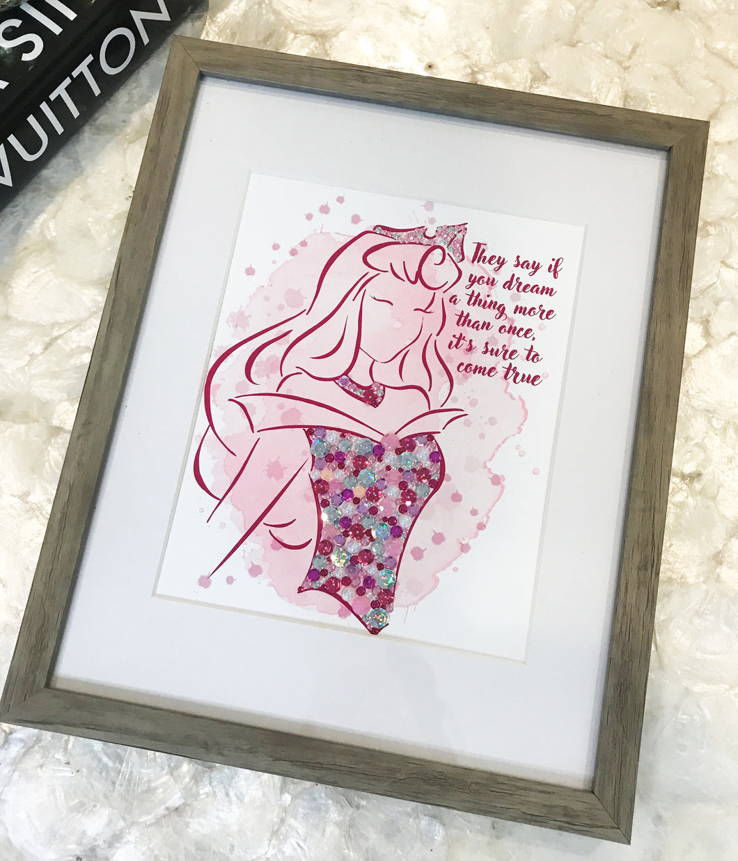 Princess Aurora has been hand embellished with rhinestones, pearls, and sequins for a beautiful sparkle. Perfect gift for your little Sleeping beauty! Frame is 12.25" x 15.25"